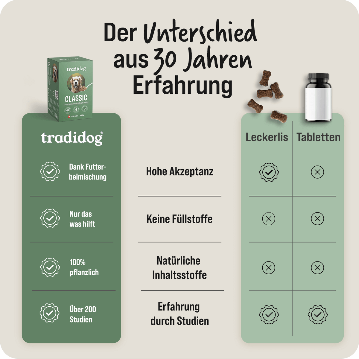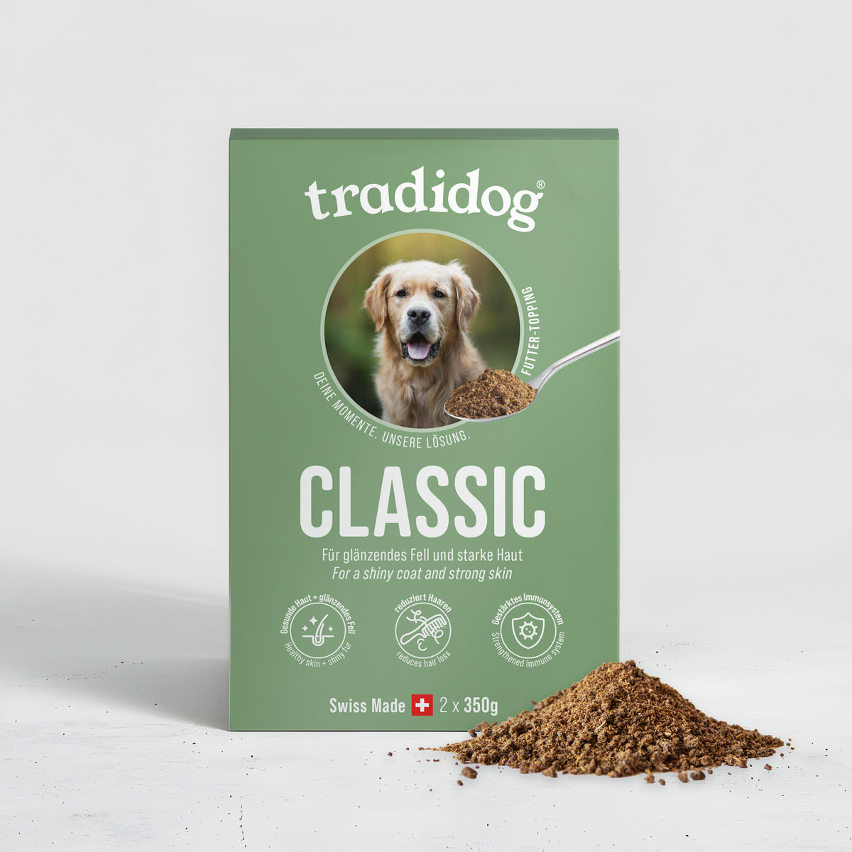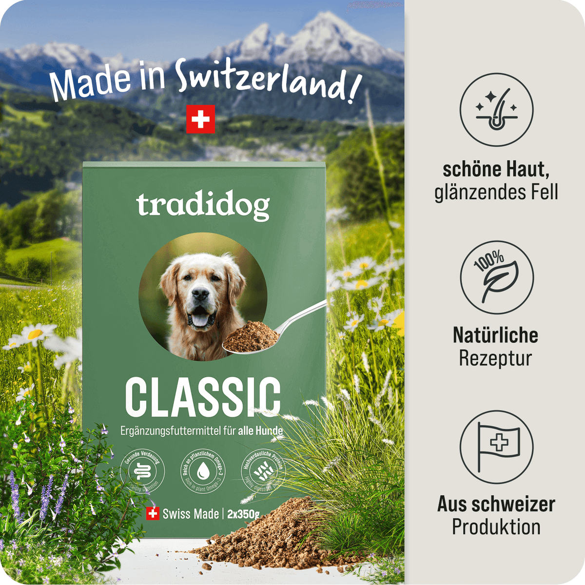 Bei Tradidog steht dein Hund im Mittelpunkt – jeden Tag, bei jeder Entscheidung. Wir produzieren alles selbst und ausschliesslich in der Schweiz, mit der Sorgfalt und Präzision, die du von Schweizer Qualität erwarten darfst. Unsere Zutaten sind rein natürlich, stammen aus kontrolliertem Anbau und werden so verarbeitet, dass ihre volle Pflanzenkraft erhalten bleibt. Denn wir glauben: Was deinem Hund wirklich hilft, kommt aus der Natur – und aus echter Verantwortung.