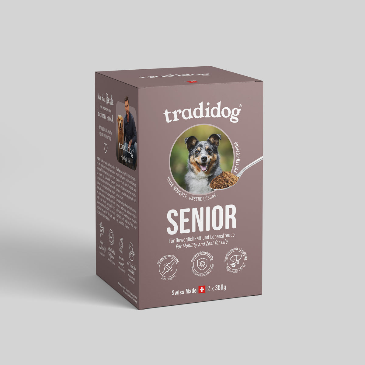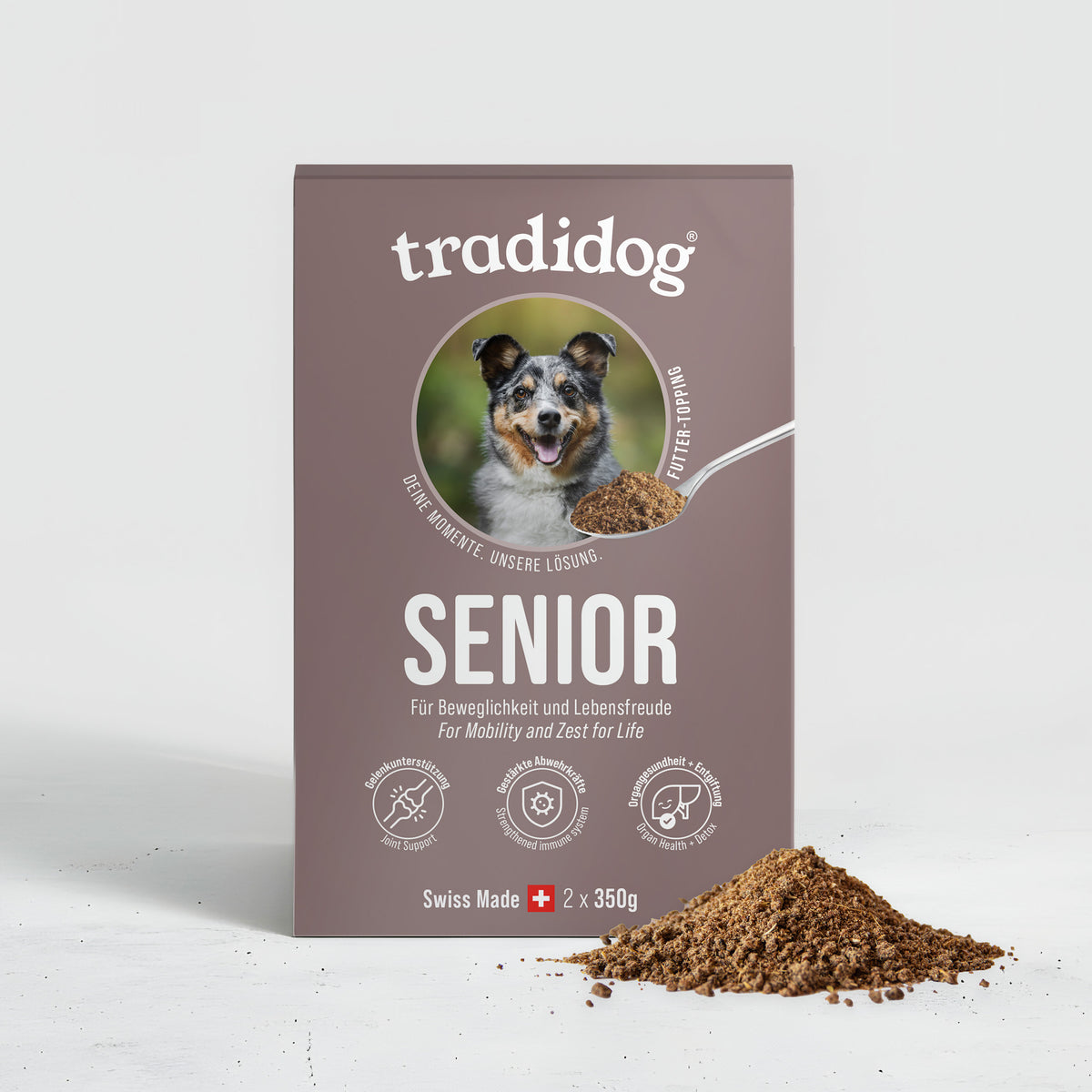Bei Tradidog steht dein Hund im Mittelpunkt – jeden Tag, bei jeder Entscheidung. Wir produzieren alles selbst und ausschliesslich in der Schweiz, mit der Sorgfalt und Präzision, die du von Schweizer Qualität erwarten darfst. Unsere Zutaten sind rein natürlich, stammen aus kontrolliertem Anbau und werden so verarbeitet, dass ihre volle Pflanzenkraft erhalten bleibt. Denn wir glauben: Was deinem Hund wirklich hilft, kommt aus der Natur – und aus echter Verantwortung.