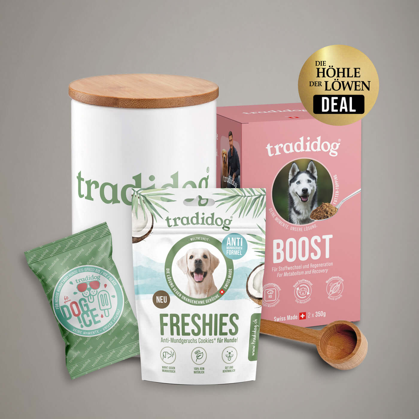 1x tradidog BOOST - 700g (2x 350g); 1x Vorratsdose; 1x Dossierlöffel; 1x Freshies - 100g; 1x DOG-ICE - 60g