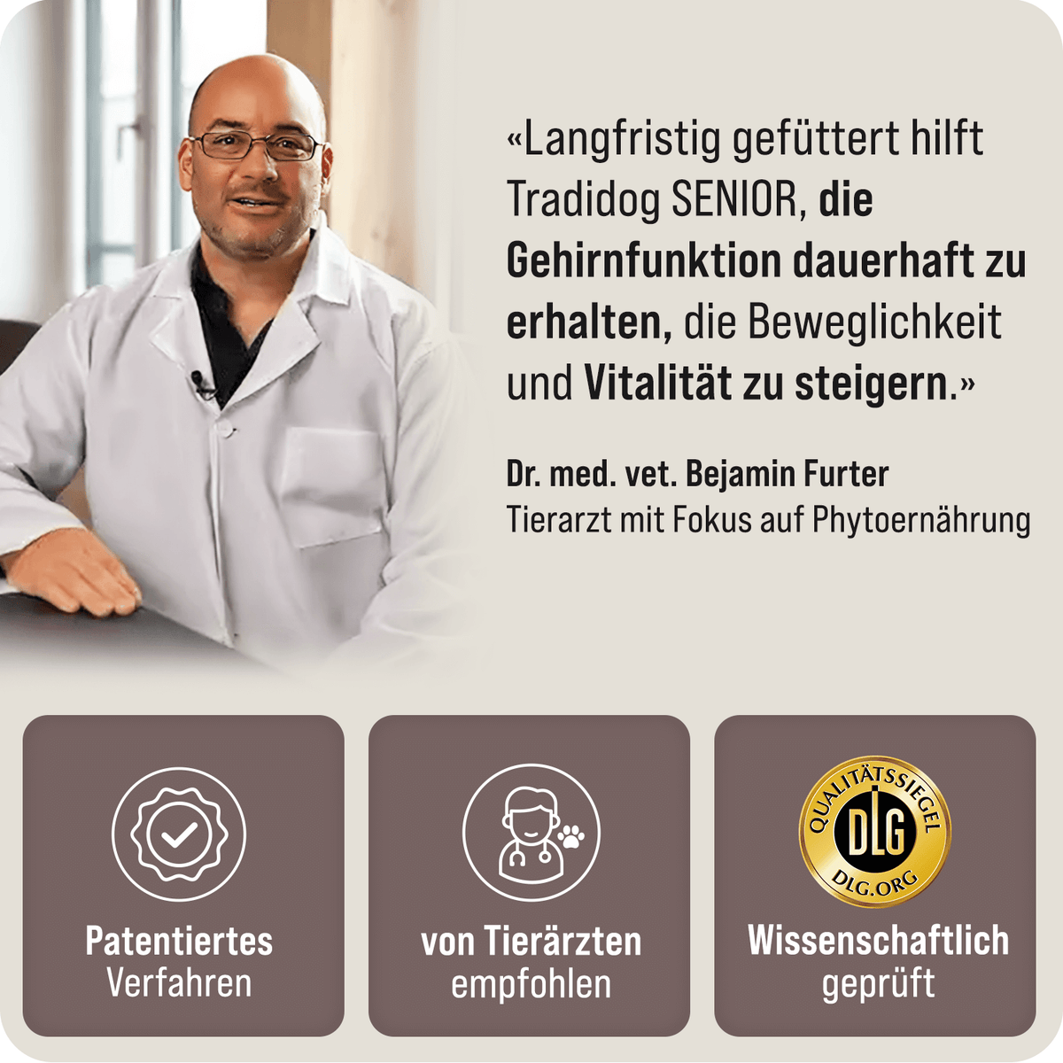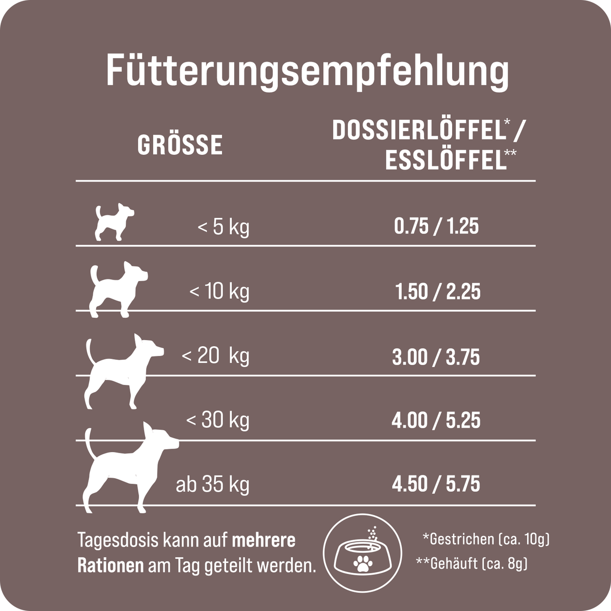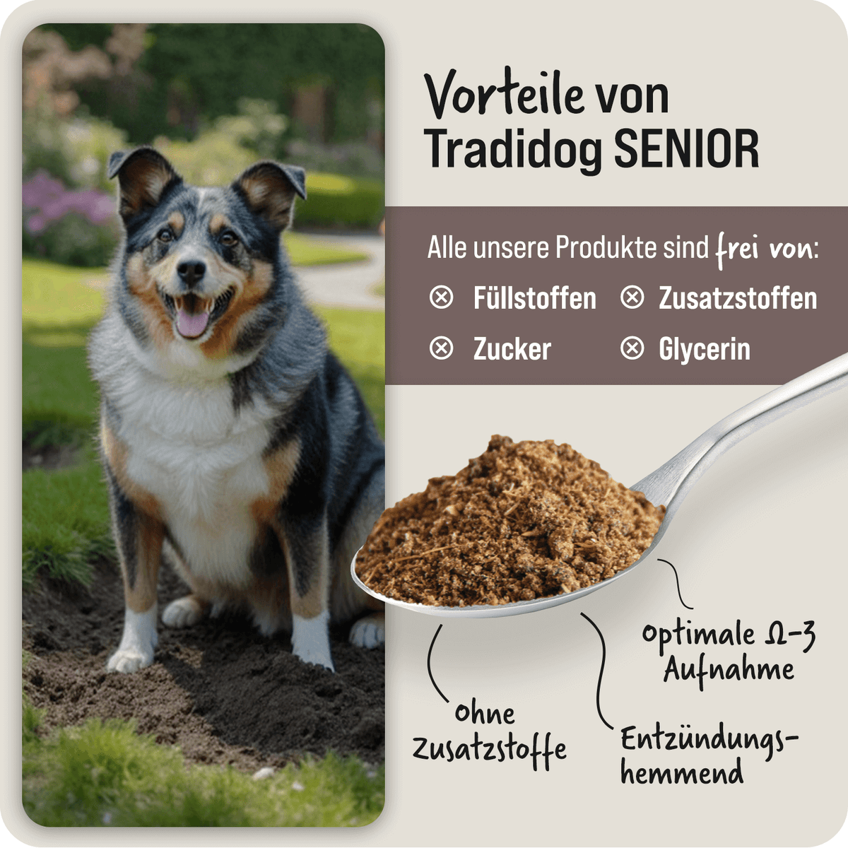 Most commercially available foods contain a maximum of 2g of omega-3 per daily portion, which is only about 50% of the recommended daily intake for medium-sized dogs. Tradidog's food topping, on the other hand, provides 2.46g of omega-3 per portion – optimally covering this requirement. This way, your dog is provided with a targeted supply of high-quality omega-3 fatty acids! Learn more