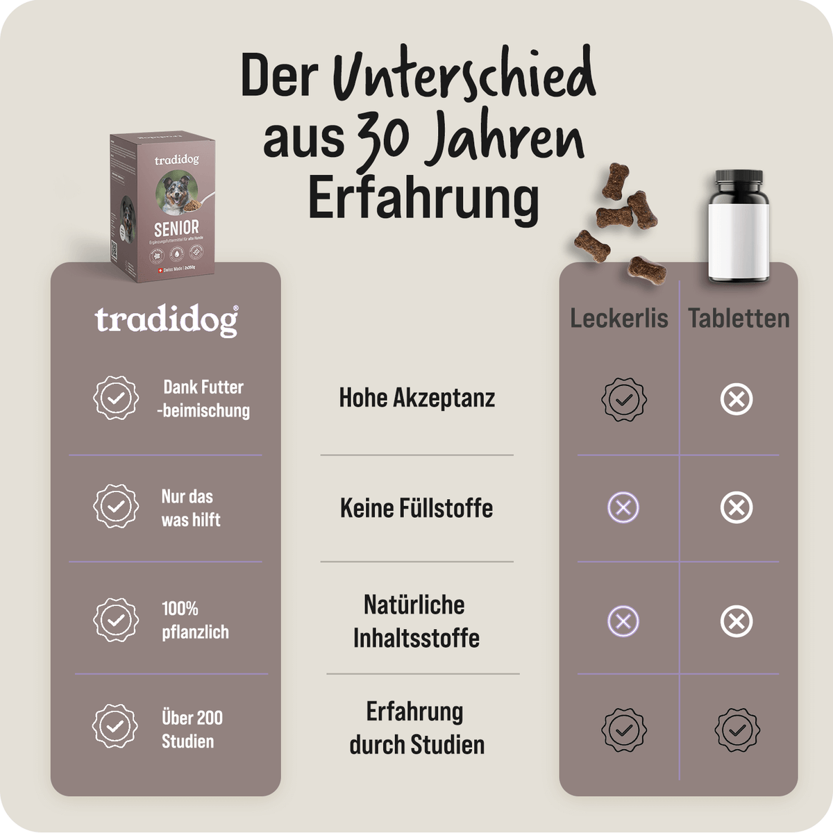 At Tradidog, your dog is our focus – every day, in every decision. We produce everything ourselves and exclusively in Switzerland, with the care and precision you expect from Swiss quality. Our ingredients are purely natural, come from controlled cultivation, and are processed in a way that preserves their full plant potency. Because we believe that what truly helps your dog comes from nature – and from genuine responsibility.