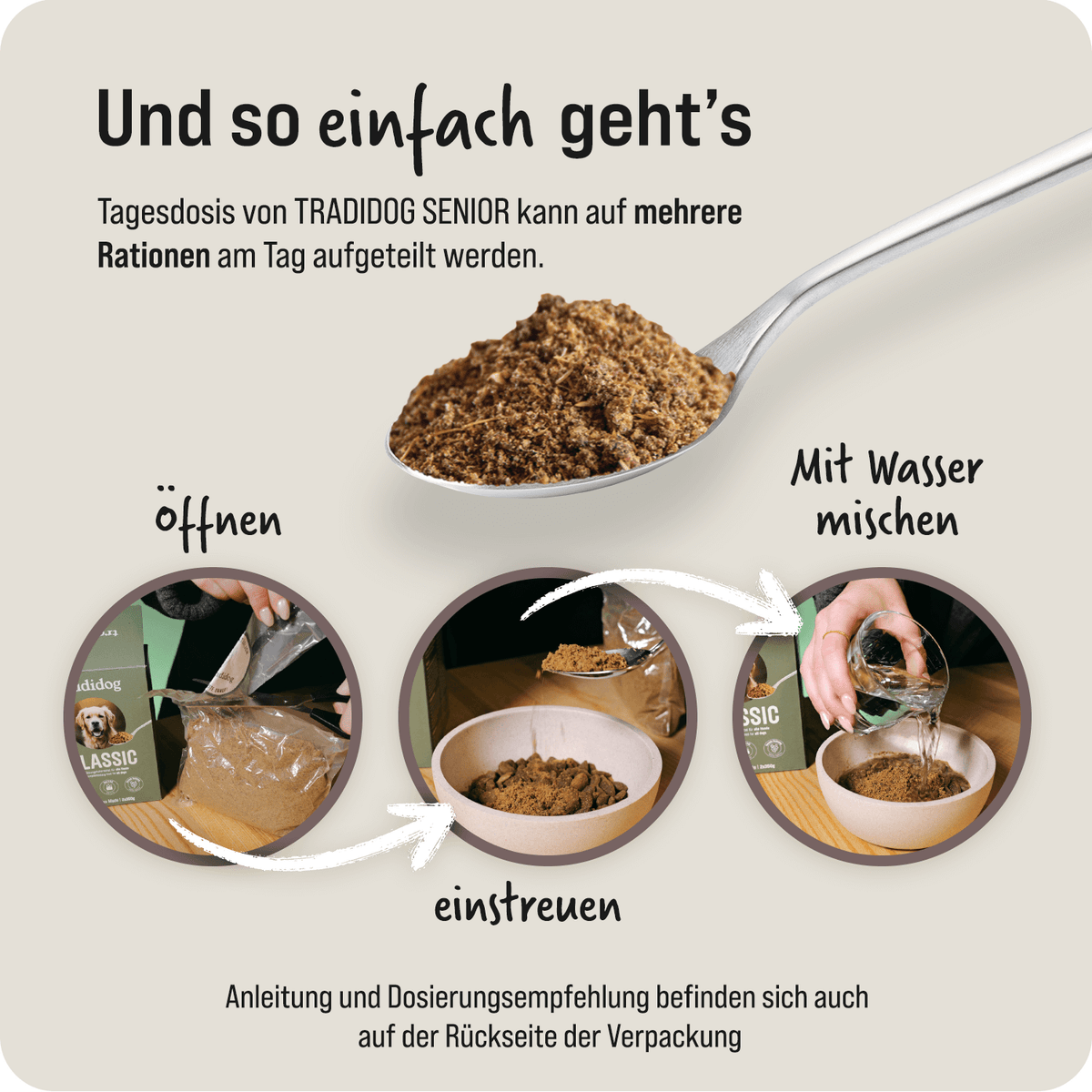 1x tradidog SENIOR - 700g (2x 350g); 1x storage container; 1x dosing spoon; 1x Freshies - 100g; 1x DOG ICE - 60g