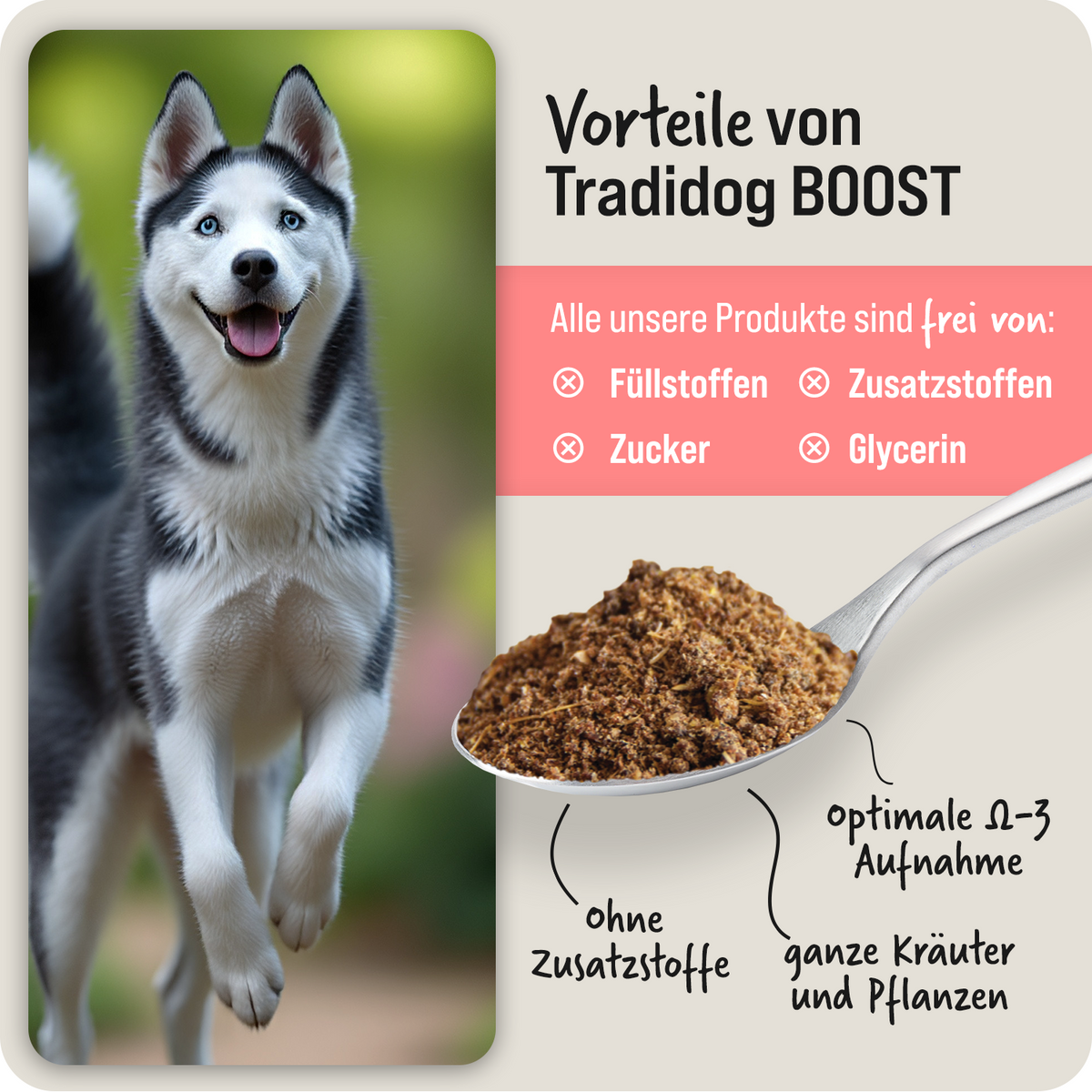 1x tradidog BOOST - 700g (2x 350g); 1x Vorratsdose; 1x Dossierlöffel; 1x Freshies - 100g; 1x DOG-ICE - 60g
