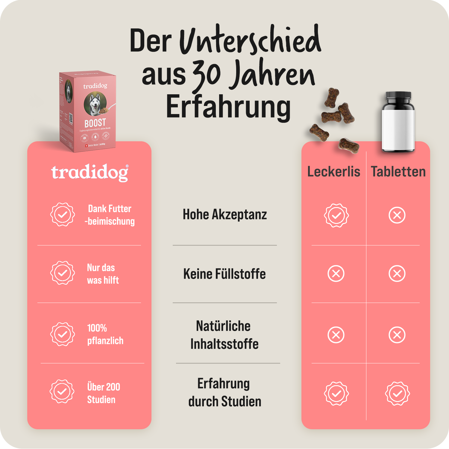 Bei Tradidog steht dein Hund im Mittelpunkt – jeden Tag, bei jeder Entscheidung. Wir produzieren alles selbst und ausschliesslich in der Schweiz, mit der Sorgfalt und Präzision, die du von Schweizer Qualität erwarten darfst. Unsere Zutaten sind rein natürlich, stammen aus kontrolliertem Anbau und werden so verarbeitet, dass ihre volle Pflanzenkraft erhalten bleibt. Denn wir glauben: Was deinem Hund wirklich hilft, kommt aus der Natur – und aus echter Verantwortung.