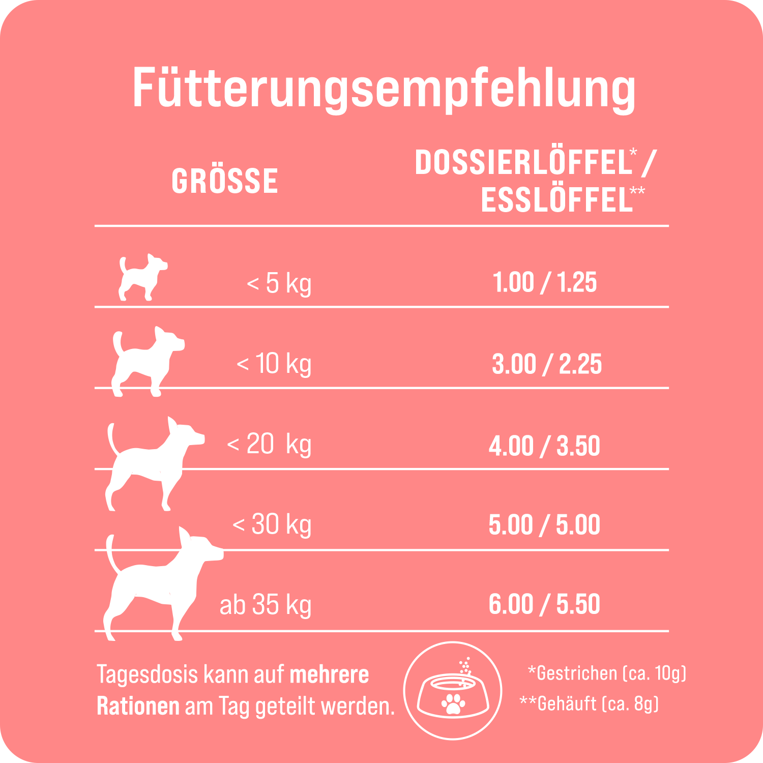 Die meisten handelsüblichen Futtermittel enthalten maximal 2g Omega-3 pro Tagesration, was nur etwa 50% des empfohlenen Bedarfs für mittelgroße Hunde entspricht. Das Tradidog Futtertopping liefert hingegen 2.46g Omega-3 pro Portion – und deckt damit den Bedarf optimal ab. So wird dein Hund gezielt mit hochwertigen Omega-3-Fettsäuren versorgt! Mehr Erfahren