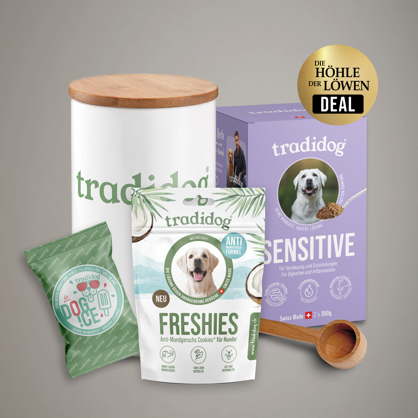1x tradidog SENSITIVE - 700g (2x 350g); 1x Vorratsdose; 1x Dossierlöffel; 1x Freshies - 100g; 1x DOG-ICE - 60g