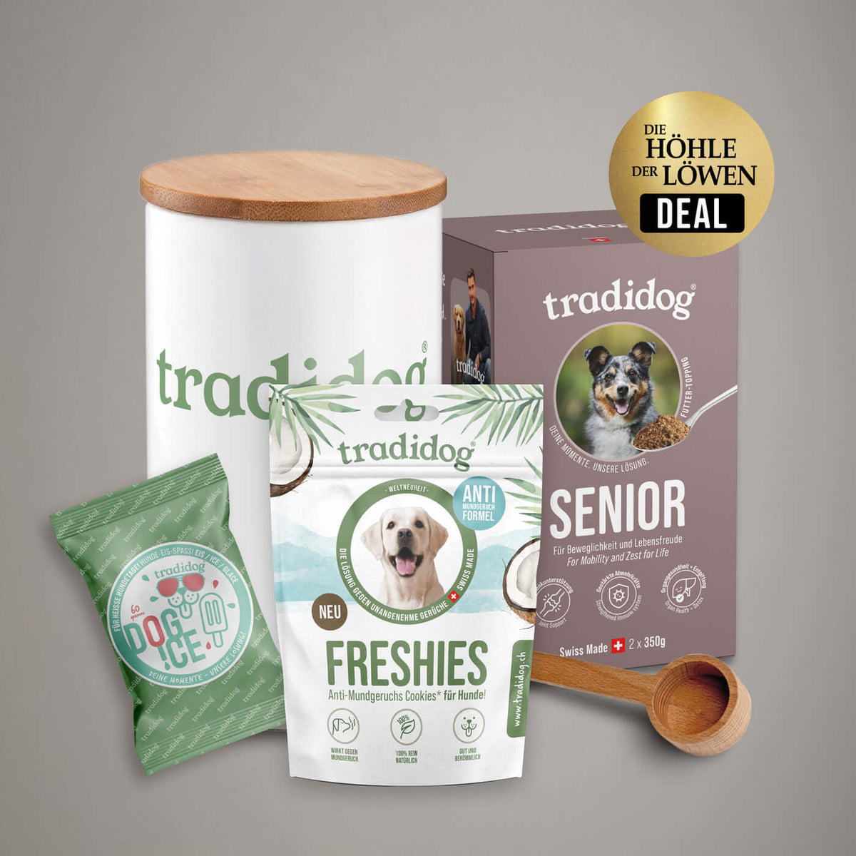 1x tradidog SENIOR - 700g (2x 350g); 1x Vorratsdose; 1x Dossierlöffel; 1x Freshies - 100g; 1x DOG-ICE - 60g